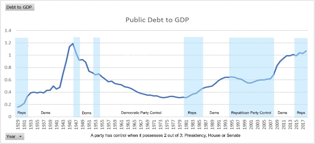 Public Debt vs GDP and Party Control of Federal Government.  https://www.thebalance.com/national-debt-by-year-compared-to-gdp-and-major-events-3306287